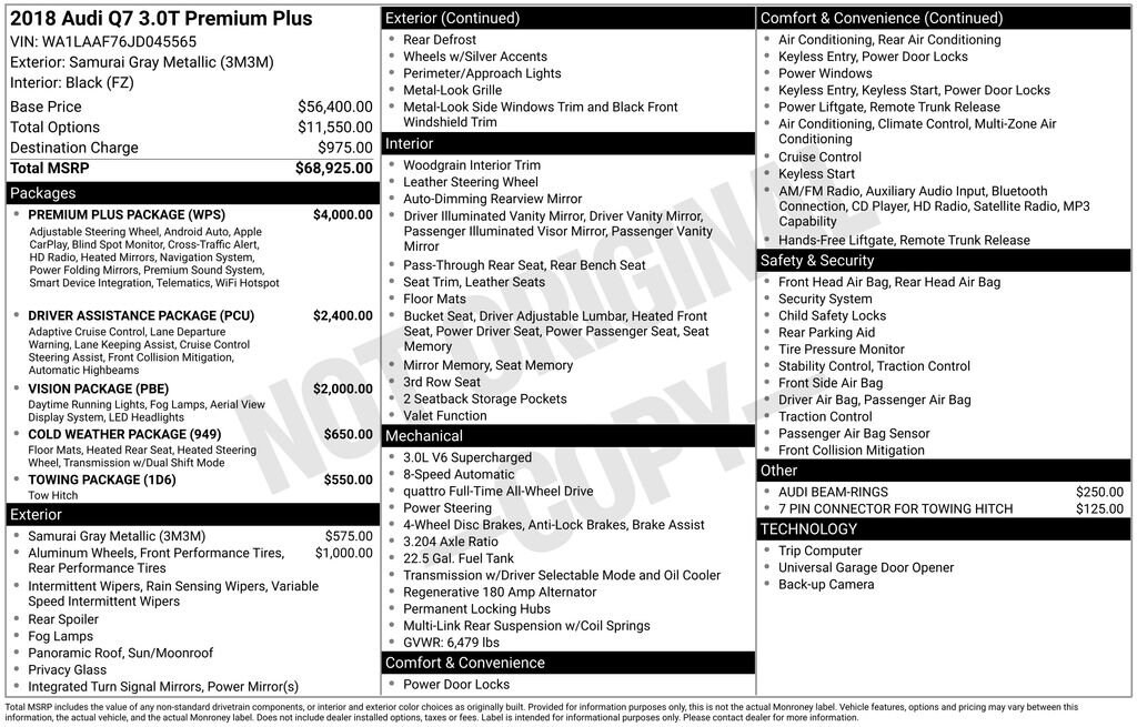 Recent Arrival! 2018 Gray Metallic Audi Q7 3.0T Premium PlusThis vehicle passed our Rigorous Safety inspection Performed by a Certified Technician. Value Internet Pricing: ALL of our customers receive REAL-TIME market value pricing. Our internet team spend countless hours ensuring we have the best price, based on equipment, mileage and condition. For your peace of mind, all of our vehicles include over 50 photos for you to judge the condition yourself. We provide a Carfax/ VIN history report and service records for every vehicle. As you do your comparison shopping, youâll see Ganley Chevy of Aurora offers the best values in the market. Weâre also prepared to offer the very best financing and warranty options. Nobody beats our interest rates! Have a car youâd like to sell? Weâll pay top dollar for it. For the most up-to-date pricing, photos, and inventory please visit www.GanleyGM.com. Call or stop by Chevy of Aurora today. 310 W. Garfield Rd. Aurora, Ohio 44202. 330-562-8585. Out of town buyers: free airport pick-up. We can help arrange delivery right to your front door too!At Ken Ganley Chevrolet Aurora, we are proud to be a trusted Chevrolet dealership serving Aurora, Ohio, and the surrounding communities including Cleveland, Akron, Solon, Twinsburg, Hudson, and Streetsboro. As part of the Ken Ganley Automotive Group, our mission is to deliver an exceptional automotive experience built on integrity, transparency, and outstanding customer service. We offer a wide selection of new Chevrolet vehicles, from dependable sedans to powerful trucks and family-friendly SUVs, along with a carefully inspected inventory of pre-owned and certified pre-owned vehicles. Whether youâre searching for a new Chevy Silverado, Equinox, Traverse, or a quality used car, our knowledgeable sales team is here to help you find the perfect fit for your lifestyle and budget. Beyond sales, our commitment continues with a state-of-the-art service and parts department staffed by factory-trained technicians. From routine maintenance to major repairs, we use genuine Chevrolet parts to keep your vehicle running at its best for years to come. At Ken Ganley Chevrolet Aurora, we value long-term relationships and strive to be the dealership you can rely on for all your automotive needs. We look forward to welcoming drivers from Aurora and nearby cities and helping you experience the difference of shopping with a dealership that truly puts customers first.