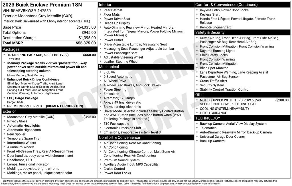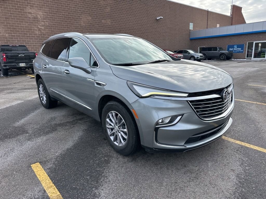 Recent Arrival! 2023 Moonstone Gray Metallic Buick Enclave Premium Group AWD, 2nd Row Heated Outboard Seats, 6-Way Power Front Passenger Seat Adjuster, Automatic temperature control, Bose Performance-Enhanced 10-Speaker System, Front & Rear Park Assist, Heads-Up Display, Heated Steering Wheel, Memory Package, Memory seat, Navigation System, Power driver seat, Power Liftgate, Preferred Equipment Group 1SN, Radio: Buick Infotainment Sys AM/FM Stereo w/Nav, Rear Backup Camera, SiriusXM w/360L, Steering wheel mounted audio controls, Ventilated Driver & Front Passenger Seats, Wireless Apple CarPlay/Wireless Android Auto.Odometer is 14715 miles below market average!This vehicle passed our Rigorous Safety inspection Performed by a Certified Technician. Value Internet Pricing: ALL of our customers receive REAL-TIME market value pricing. Our internet team spend countless hours ensuring we have the best price, based on equipment, mileage and condition. For your peace of mind, all of our vehicles include over 50 photos for you to judge the condition yourself. We provide a Carfax/ VIN history report and service records for every vehicle. As you do your comparison shopping, youâll see Ganley Chevy of Aurora offers the best values in the market. Weâre also prepared to offer the very best financing and warranty options. Nobody beats our interest rates! Have a car youâd like to sell? Weâll pay top dollar for it. For the most up-to-date pricing, photos, and inventory please visit www.GanleyGM.com. Call or stop by Chevy of Aurora today. 310 W. Garfield Rd. Aurora, Ohio 44202. 330-562-8585. Out of town buyers: free airport pick-up. We can help arrange delivery right to your front door too!At Ken Ganley Chevrolet Aurora, we are proud to be a trusted Chevrolet dealership serving Aurora, Ohio, and the surrounding communities including Cleveland, Akron, Solon, Twinsburg, Hudson, and Streetsboro. As part of the Ken Ganley Automotive Group, our mission is to deliver an exceptional automotive experience built on integrity, transparency, and outstanding customer service. We offer a wide selection of new Chevrolet vehicles, from dependable sedans to powerful trucks and family-friendly SUVs, along with a carefully inspected inventory of pre-owned and certified pre-owned vehicles. Whether youâre searching for a new Chevy Silverado, Equinox, Traverse, or a quality used car, our knowledgeable sales team is here to help you find the perfect fit for your lifestyle and budget. Beyond sales, our commitment continues with a state-of-the-art service and parts department staffed by factory-trained technicians. From routine maintenance to major repairs, we use genuine Chevrolet parts to keep your vehicle running at its best for years to come. At Ken Ganley Chevrolet Aurora, we value long-term relationships and strive to be the dealership you can rely on for all your automotive needs. We look forward to welcoming drivers from Aurora and nearby cities and helping you experience the difference of shopping with a dealership that truly puts customers first.