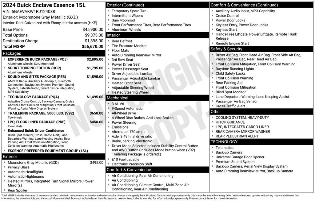 Recent Arrival! 2024 Moonstone Gray Metallic Buick Enclave Essence AWD, 120-Volt Power Outlet, 1st & 2nd Row All-Weather Floor Liners (LPO), 3rd Row All-Weather Floor Liner (LPO), 4-Wheel independent suspension, 5,000 lbs Trailering Package, Adaptive Cruise Control, Automatic temperature control, Bose Performance-Enhanced 10-Speaker System, Enhanced Automatic Emergency Braking, Experience Buick Package, Floor Liner Package (LPO), Front Power Sliding Moonroof, HD Surround Vision, Heavy-Duty Cooling System, Hitch Guidance, Hitch Guidance w/Hitch View, Inside Rearview Mirror w/Full Camera Display, Integrated Cargo Liner (LPO), Power Liftgate, Preferred Equipment Group 1SL, Radio: Buick Infotainment Sys AM/FM Stereo w/Nav, Rear Camera Mirror Washer, Rear Pedestrian Alert, SiriusXM w/360L, Sound & Sites Package, Sport Touring Edition, Sport Touring Liftgate Badging, Technology Package, Unique Sport Grille w/Body-Color Surround, Vehicle Health Management, Wheels: 20 Gloss Black, Wireless Apple CarPlay/Wireless Android Auto.Clean CARFAX. Odometer is 6249 miles below market average!This vehicle passed our Rigorous Safety inspection Performed by a Certified Technician. Value Internet Pricing: ALL of our customers receive REAL-TIME market value pricing. Our internet team spend countless hours ensuring we have the best price, based on equipment, mileage and condition. For your peace of mind, all of our vehicles include over 50 photos for you to judge the condition yourself. We provide a Carfax/ VIN history report and service records for every vehicle. As you do your comparison shopping, youâll see Ganley Chevy of Aurora offers the best values in the market. Weâre also prepared to offer the very best financing and warranty options. Nobody beats our interest rates! Have a car youâd like to sell? Weâll pay top dollar for it. For the most up-to-date pricing, photos, and inventory please visit www.GanleyGM.com. Call or stop by Chevy of Aurora today. 310 W. Garfield Rd. Aurora, Ohio 44202. 330-562-8585. Out of town buyers: free airport pick-up. We can help arrange delivery right to your front door too!At Ken Ganley Chevrolet Aurora, we are proud to be a trusted Chevrolet dealership serving Aurora, Ohio, and the surrounding communities including Cleveland, Akron, Solon, Twinsburg, Hudson, and Streetsboro. As part of the Ken Ganley Automotive Group, our mission is to deliver an exceptional automotive experience built on integrity, transparency, and outstanding customer service. We offer a wide selection of new Chevrolet vehicles, from dependable sedans to powerful trucks and family-friendly SUVs, along with a carefully inspected inventory of pre-owned and certified pre-owned vehicles. Whether youâre searching for a new Chevy Silverado, Equinox, Traverse, or a quality used car, our knowledgeable sales team is here to help you find the perfect fit for your lifestyle and budget. Beyond sales, our commitment continues with a state-of-the-art service and parts department staffed by factory-trained technicians. From routine maintenance to major repairs, we use genuine Chevrolet parts to keep your vehicle running at its best for years to come. At Ken Ganley Chevrolet Aurora, we value long-term relationships and strive to be the dealership you can rely on for all your automotive needs. We look forward to welcoming drivers from Aurora and nearby cities and helping you experience the difference of shopping with a dealership that truly puts customers first.