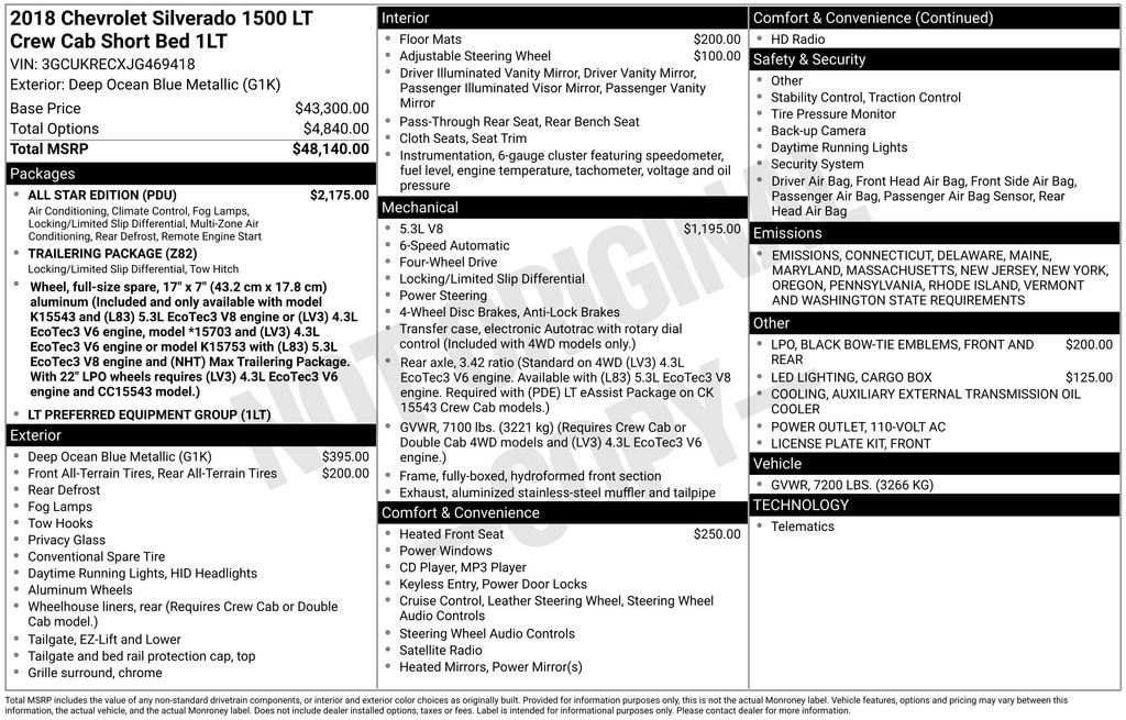 2018 Deep Ocean Blue Metallic Chevrolet Silverado 1500 LT 110-Volt AC Power Outlet, 17 Bright Machined Aluminum Wheels, 3.42 Rear Axle Ratio, All Star Edition, Deep-Tinted Glass, Dual-Zone Automatic Climate Control, Electric Rear-Window Defogger, Heated Driver & Front Passenger Seats, Heavy-Duty Rear Locking Differential, Remote Vehicle Starter System, Theft Deterrent System (Unauthorized Entry), Thin Profile LED Fog Lamps, Trailering Package.