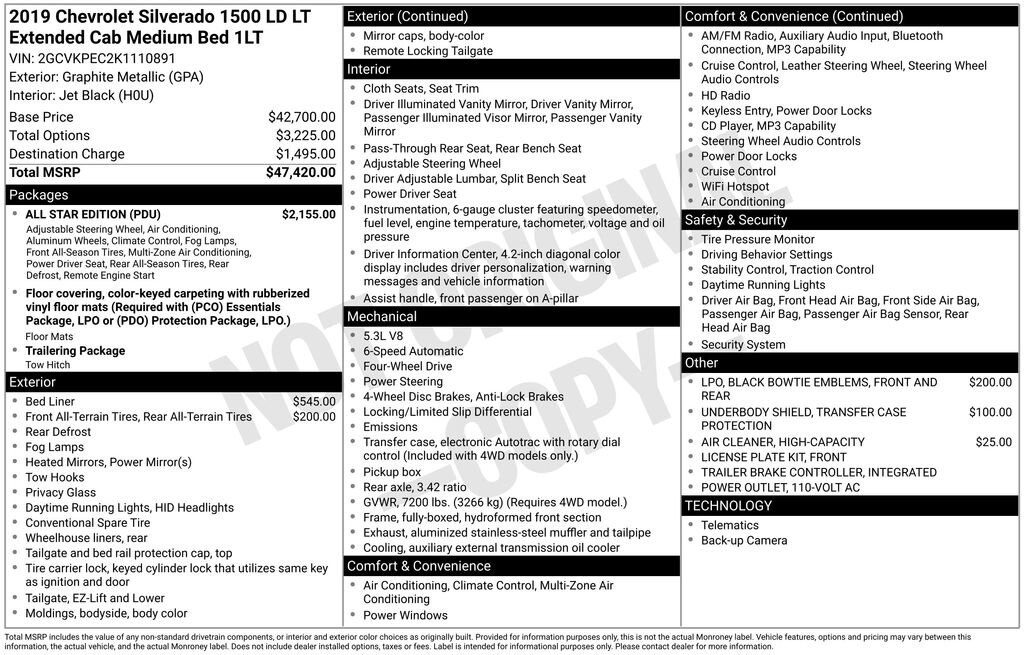 2019 Graphite Metallic Chevrolet Silverado 1500 LD LT 10-Way Power Driver's Seat Adjuster, 110-Volt AC Power Outlet, 4.2 Diagonal Color Display Driver Info Center, All Star Edition, Body Color Bodyside Moldings, Body-Color Door Handles, Body-Color Mirror Caps, Body-Color Power-Adjustable Heated Outside Mirrors, Chevrolet 4G LTE, Chevrolet Connected Access, Chrome Front Bumper, Chrome Grille Surround, Chrome Rear Bumper, Color-Keyed Carpeting Floor Covering, Deep-Tinted Glass, Driver & Fr Passenger Illuminated Vanity Mirrors, Dual-Zone Automatic Climate Control, Electronic AutoTrac Transfer Case, HD Radio, Integrated Trailer Brake Controller, Leather Wrapped Steering Wheel, Manual Tilt & Telescoping Steering Column, Manual Tilt-Wheel Steering Column, OnStar & Chevrolet Connected Services Capable, Preferred Equipment Group 1LT, Rear 60/40 Folding Bench Seat (Folds Up), Rear Wheelhouse Liners, Rear-Window Electric Defogger, Remote Keyless Entry, Remote Locking Tailgate, Remote Vehicle Starter System, Single Slot CD/MP3 Player, SiriusXM Radio, Steering Wheel Audio Controls, Unauthorized Entry Theft-Deterrent System.