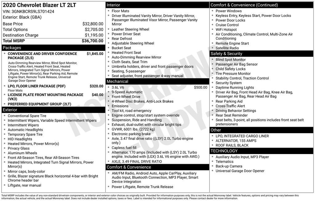 Recent Arrival! 2020 Black Chevrolet Blazer LT 1st & 2nd Row All-Weather Floor Liners (LPO), Black Roof Rails, Convenience & Driver Confidence Package, Floor Liner Package (LPO), Heated Driver & Front Passenger Seats, Inside Rear-View Auto-Dimming Mirror, Integrated Cargo Liner (LPO), Lane Change Alert w/Side Blind Zone Alert, Outside Heated Power-Adjustable Body-Color Mirrors, Preferred Equipment Group 2LT, Rear Cross Traffic Alert, Rear Park Assist w/Audible Warning, Rear Power Programmable Liftgate, Remote Start, Universal Home Remote.Clean CARFAX. Odometer is 26708 miles below market average! 19/26 City/Highway MPGThis vehicle passed our Rigorous Safety inspection Performed by a Certified Technician. Value Internet Pricing: ALL of our customers receive REAL-TIME market value pricing. Our internet team spend countless hours ensuring we have the best price, based on equipment, mileage and condition. For your peace of mind, all of our vehicles include over 50 photos for you to judge the condition yourself. We provide a Carfax/ VIN history report and service records for every vehicle. As you do your comparison shopping, youâll see Ganley Chevy of Aurora offers the best values in the market. Weâre also prepared to offer the very best financing and warranty options. Nobody beats our interest rates! Have a car youâd like to sell? Weâll pay top dollar for it. For the most up-to-date pricing, photos, and inventory please visit www.GanleyGM.com. Call or stop by Chevy of Aurora today. 310 W. Garfield Rd. Aurora, Ohio 44202. 330-562-8585. Out of town buyers: free airport pick-up. We can help arrange delivery right to your front door too!At Ken Ganley Chevrolet Aurora, we are proud to be a trusted Chevrolet dealership serving Aurora, Ohio, and the surrounding communities including Cleveland, Akron, Solon, Twinsburg, Hudson, and Streetsboro. As part of the Ken Ganley Automotive Group, our mission is to deliver an exceptional automotive experience built on integrity, transparency, and outstanding customer service. We offer a wide selection of new Chevrolet vehicles, from dependable sedans to powerful trucks and family-friendly SUVs, along with a carefully inspected inventory of pre-owned and certified pre-owned vehicles. Whether youâre searching for a new Chevy Silverado, Equinox, Traverse, or a quality used car, our knowledgeable sales team is here to help you find the perfect fit for your lifestyle and budget. Beyond sales, our commitment continues with a state-of-the-art service and parts department staffed by factory-trained technicians. From routine maintenance to major repairs, we use genuine Chevrolet parts to keep your vehicle running at its best for years to come. At Ken Ganley Chevrolet Aurora, we value long-term relationships and strive to be the dealership you can rely on for all your automotive needs. We look forward to welcoming drivers from Aurora and nearby cities and helping you experience the difference of shopping with a dealership that truly puts customers first.