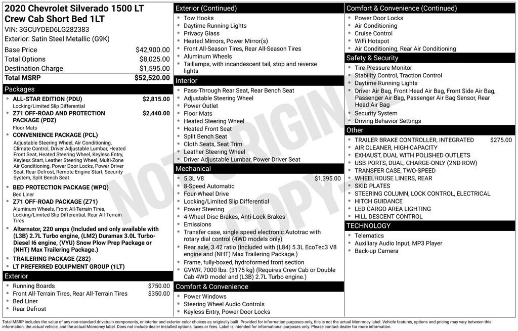 Recent Arrival! 2020 Satin Steel Metallic Chevrolet Silverado 1500 LT 8-Speed Automatic, 4WD, Jet Black w/Cloth Seat Trim, 10-Way Power Driver Seat w/Lumbar, 12-Volt Rear Auxiliary Power Outlet, 2 USB Ports (First Row), 4-Way Manual Driver Seat Adjuster, 4.2 Diagonal Color Display Driver Info Center, 40/20/40 Front Split-Bench Seat, 4G LTE Wi-Fi Hot Spot Capable, 6 Rectangular Chromed Tubular Assist Steps (LPO), All-Star Edition, Bluetooth® For Phone, Chevrolet Connected Access Capable, Chrome Grille, Chrome Mirror Caps, Color-Keyed Carpeting Floor Covering, Compass, Convenience Package, Deep-Tinted Glass, Dual-Zone Automatic Climate Control, Electric Rear-Window Defogger, Electrical Lock Control Steering Column, EZ Lift Power Lock & Release Tailgate, Front Frame-Mounted Black Recovery Hooks, Front Rubberized Vinyl Floor Mats, Heated Driver & Front Outboard Passenger Seats, Heated Steering Wheel, Heavy-Duty Rear Locking Differential, Hitch Guidance, Integrated Trailer Brake Controller, Keyless Open & Start, Leather Wrapped Steering Wheel, LED Cargo Area Lighting, Locking Tailgate, Manual Tilt-Wheel Steering Column, Manual Tilt/Telescoping Steering Column, OnStar & Chevrolet Connected Services Capable, Power Door Locks, Power Front Windows w/Driver Express Up/Down, Power Front Windows w/Passenger Express Down, Power Rear Windows w/Express Down, Preferred Equipment Group 1LT, Rear 60/40 Folding Bench Seat (Folds Up), Rear Dual USB Charging-Only Ports, Rear Rubberized-Vinyl Floor Mats, Rear Vision Camera, Remote Keyless Entry, Remote Vehicle Starter System, Single-Zone Manual/Semi-Automatic Air Conditioning, Steering Wheel Audio Controls, Steering Wheel Mounted Electronic Cruise Control, Theft Deterrent System (Unauthorized Entry), Trailering Package, Urethane Steering Wheel.CARFAX One-Owner. Clean CARFAX. Odometer is 29986 miles below market average!This vehicle passed our Rigorous Safety inspection Performed by a Certified Technician. Value Internet Pricing: ALL of our customers receive REAL-TIME market value pricing. Our internet team spend countless hours ensuring we have the best price, based on equipment, mileage and condition. For your peace of mind, all of our vehicles include over 50 photos for you to judge the condition yourself. We provide a Carfax/ VIN history report and service records for every vehicle. As you do your comparison shopping, youâll see Ganley Chevy of Aurora offers the best values in the market. Weâre also prepared to offer the very best financing and warranty options. Nobody beats our interest rates! Have a car youâd like to sell? Weâll pay top dollar for it. For the most up-to-date pricing, photos, and inventory please visit www.GanleyGM.com. Call or stop by Chevy of Aurora today. 310 W. Garfield Rd. Aurora, Ohio 44202. 330-562-8585. Out of town buyers: free airport pick-up. We can help arrange delivery right to your front door too!At Ken Ganley Chevrolet Aurora, we are proud to be a trusted Chevrolet dealership serving Aurora, Ohio, and the surrounding communities including Cleveland, Akron, Solon, Twinsburg, Hudson, and Streetsboro. As part of the Ken Ganley Automotive Group, our mission is to deliver an exceptional automotive experience built on integrity, transparency, and outstanding customer service. We offer a wide selection of new Chevrolet vehicles, from dependable sedans to powerful trucks and family-friendly SUVs, along with a carefully inspected inventory of pre-owned and certified pre-owned vehicles. Whether youâre searching for a new Chevy Silverado, Equinox, Traverse, or a quality used car, our knowledgeable sales team is here to help you find the perfect fit for your lifestyle and budget. Beyond sales, our commitment continues with a state-of-the-art service and parts department staffed by factory-trained technicians. From routine maintenance to major repairs, we use genuine Chevrolet parts to keep your vehicle running at its best for years to come