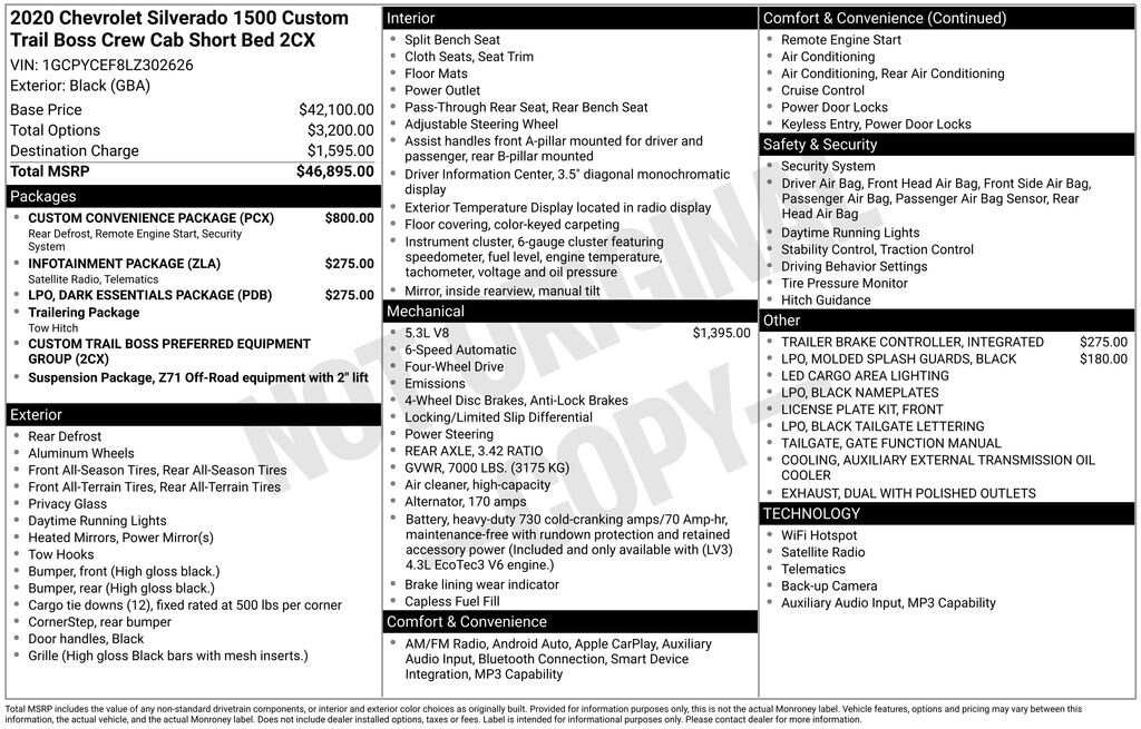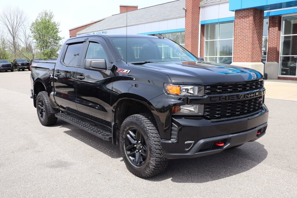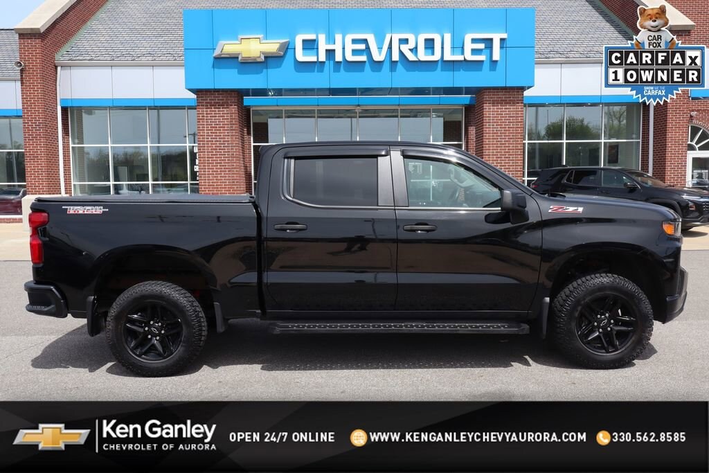 Recent Arrival! 2020 Black Chevrolet Silverado 1500 Custom Trail Boss 6-Speed Automatic Electronic with Overdrive, 4WD, Jet Black w/Cloth Seat Trim, 170 Amps Alternator, 3.5 Diagonal Monochromatic Display, 4G LTE Wi-Fi Hot Spot Capable, Apple CarPlay/Android Auto, Black Name Plates (LPO), Black Tailgate CHEVROLET Lettering (LPO), Bluetooth® For Phone, Chevrolet Connected Access Capable, Color-Keyed Carpeting Floor Covering, Compass, Custom Convenience Package, Dark Essentials Package (LPO), Deep-Tinted Glass, Electric Rear-Window Defogger, EZ Lift Power Lock & Release Tailgate, Front Rubberized Vinyl Floor Mats, Heated door mirrors, Heavy-Duty Rear Locking Differential, High Capacity Air Filter, High Gloss Black Grille, Hill Descent Control, Hitch Guidance, Infotainment Package, Integrated Trailer Brake Controller, LED Cargo Area Lighting, Locking Tailgate, Manual Tilt-Wheel Steering Column, Off-Road Suspension w/2 Lift, OnStar & Chevrolet Connected Services Capable, Performance Red Recovery Hooks, Power Door Locks, Power Front Windows w/Driver Express Up/Down, Power Front Windows w/Passenger Express Down, Power Rear Windows w/Express Down, Preferred Equipment Group 2CX, Radio: Chevrolet Infotainment 3 System, Rear 60/40 Folding Bench Seat (Folds Up), Rear Rubberized-Vinyl Floor Mats, Remote Keyless Entry, Remote Vehicle Starter System, SiriusXM Radio, Steering Wheel Mounted Electronic Cruise Control, Suspension Package, Theft Deterrent System (Unauthorized Entry), Traction control, Trailering Package, Wheels: 18 x 8.5 Black Painted Aluminum.CARFAX One-Owner. Clean CARFAX.This vehicle passed our Rigorous Safety inspection Performed by a Certified Technician. Value Internet Pricing: ALL of our customers receive REAL-TIME market value pricing. Our internet team spend countless hours ensuring we have the best price, based on equipment, mileage and condition. For your peace of mind, all of our vehicles include over 50 photos for you to judge the condition yourself. We provide a Carfax/ VIN history report and service records for every vehicle. As you do your comparison shopping, youâll see Ganley Chevy of Aurora offers the best values in the market. Weâre also prepared to offer the very best financing and warranty options. Nobody beats our interest rates! Have a car youâd like to sell? Weâll pay top dollar for it. For the most up-to-date pricing, photos, and inventory please visit www.GanleyGM.com. Call or stop by Chevy of Aurora today. 310 W. Garfield Rd. Aurora, Ohio 44202. 330-562-8585. Out of town buyers: free airport pick-up. We can help arrange delivery right to your front door too!At Ken Ganley Chevrolet Aurora, we are proud to be a trusted Chevrolet dealership serving Aurora, Ohio, and the surrounding communities including Cleveland, Akron, Solon, Twinsburg, Hudson, and Streetsboro. As part of the Ken Ganley Automotive Group, our mission is to deliver an exceptional automotive experience built on integrity, transparency, and outstanding customer service. We offer a wide selection of new Chevrolet vehicles, from dependable sedans to powerful trucks and family-friendly SUVs, along with a carefully inspected inventory of pre-owned and certified pre-owned vehicles. Whether youâre searching for a new Chevy Silverado, Equinox, Traverse, or a quality used car, our knowledgeable sales team is here to help you find the perfect fit for your lifestyle and budget. Beyond sales, our commitment continues with a state-of-the-art service and parts department staffed by factory-trained technicians. From routine maintenance to major repairs, we use genuine Chevrolet parts to keep your vehicle running at its best for years to come. At Ken Ganley Chevrolet Aurora, we value long-term relationships and strive to be the dealership you can rely on for all your automotive needs. We look forward to welcoming drivers from Aurora and nearby cities and helping you experience the difference of shopping with a deale
