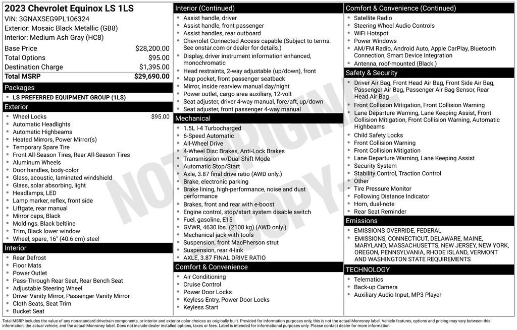 Recent Arrival! 2023 Mosaic Black Metallic Chevrolet Equinox LS Equinox LS, 4D Sport Utility, 1.5L DOHC, 6-Speed Automatic Electronic with Overdrive, AWD, Mosaic Black Metallic, Medium Ash Gray Cloth, Android Auto, Apple CarPlay, Backup Camera, Preferred Equipment Group 1LS.