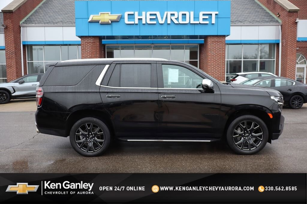 Recent Arrival! 2023 Black Chevrolet Tahoe Premier 4WD, Jet Black w/Leather-Appointed Seat Trim, 15 Diagonal Multi-Color Head-Up Display, 1st & 2nd Row Color-Keyed Carpeted Floor Mats, 2-Speed Active Electronic AutoTrac Transfer Case, 3rd Row 60/40 Power-Folding Split-Bench Seat, Auto-Dimming Inside Rear-View Mirror, Black Grille w/Chevrolet Lettering (LPO) (DISC), Black Name Plates (LPO), Bose 10-Speaker Centerpoint Surround Audio Sys Ft, Bright Front & Rear Door Sill Plates, Chrome Door Handles w/Body-Color Strip, Chrome Mirror Caps, Color-Keyed Carpeting Floor Covering, Driver & Front Outboard Passenger Airbags, Dual Exhaust System, Dual-Pane Power Panoramic Sunroof, Enhanced Display & Alert Package, Enhanced Driver Information Center, Floor Console, Hands-Free Rear Power Programmable Liftgate, HD Surround Vision, Heated 2nd Row Outboard Seats, Heated Steering Wheel, Hill Descent Control, Infotainment Display, Inside Rearview Auto-Dimming Rear Camera Mirror, Lane Change Alert w/Side Blind Zone Alert, LED Daytime Running Lamps, Memory Settings, Outside Heated Power-Adjustable Mirrors, Power Release 2nd Row Bucket Seats, Power Tilt & Telescopic Steering Column, Preferred Equipment Group 1LZ, Rear Camera Mirror Washer, Rear Cross Traffic Alert, Rear Pedestrian Alert, Remote Start, Safety Alert Seat, Set of 4 Wheel Locks (LPO), SiriusXM Radio w/360L, Universal Home Remote, Wheels: 22 x 9 6-Spoke Carbon Flash Metallic Alum, Wireless Charging, Wrapped Steering Wheel.Clean CARFAX.This vehicle passed our Rigorous Safety inspection Performed by a Certified Technician. Value Internet Pricing: ALL of our customers receive REAL-TIME market value pricing. Our internet team spend countless hours ensuring we have the best price, based on equipment, mileage and condition. For your peace of mind, all of our vehicles include over 50 photos for you to judge the condition yourself. We provide a Carfax/ VIN history report and service records for every vehicle. As you do your comparison shopping, youâll see Ganley Chevy of Aurora offers the best values in the market. Weâre also prepared to offer the very best financing and warranty options. Nobody beats our interest rates! Have a car youâd like to sell? Weâll pay top dollar for it. For the most up-to-date pricing, photos, and inventory please visit www.GanleyGM.com. Call or stop by Chevy of Aurora today. 310 W. Garfield Rd. Aurora, Ohio 44202. 330-562-8585. Out of town buyers: free airport pick-up. We can help arrange delivery right to your front door too!At Ken Ganley Chevrolet Aurora, we are proud to be a trusted Chevrolet dealership serving Aurora, Ohio, and the surrounding communities including Cleveland, Akron, Solon, Twinsburg, Hudson, and Streetsboro. As part of the Ken Ganley Automotive Group, our mission is to deliver an exceptional automotive experience built on integrity, transparency, and outstanding customer service. We offer a wide selection of new Chevrolet vehicles, from dependable sedans to powerful trucks and family-friendly SUVs, along with a carefully inspected inventory of pre-owned and certified pre-owned vehicles. Whether youâre searching for a new Chevy Silverado, Equinox, Traverse, or a quality used car, our knowledgeable sales team is here to help you find the perfect fit for your lifestyle and budget. Beyond sales, our commitment continues with a state-of-the-art service and parts department staffed by factory-trained technicians. From routine maintenance to major repairs, we use genuine Chevrolet parts to keep your vehicle running at its best for years to come. At Ken Ganley Chevrolet Aurora, we value long-term relationships and strive to be the dealership you can rely on for all your automotive needs. We look forward to welcoming drivers from Aurora and nearby cities and helping you experience the difference of shopping with a dealership that truly puts customers first.