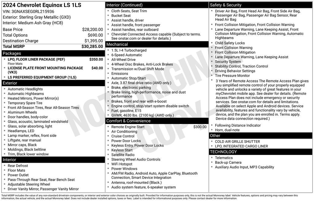 2024 Sterling Gray Metallic Chevrolet Equinox LS AWD, All-Weather Floor Liners (LPO), Floor Liner Package (LPO), Integrated Cargo Liner (LPO), Preferred Equipment Group 1LS, Remote Start.CARFAX One-Owner. Clean CARFAX. Odometer is 12210 miles below market average! 24/30 City/Highway MPGThis vehicle passed our Rigorous Safety inspection Performed by a Certified Technician. Value Internet Pricing: ALL of our customers receive REAL-TIME market value pricing. Our internet team spend countless hours ensuring we have the best price, based on equipment, mileage and condition. For your peace of mind, all of our vehicles include over 50 photos for you to judge the condition yourself. We provide a Carfax/ VIN history report and service records for every vehicle. As you do your comparison shopping, youâll see Ganley Chevy of Aurora offers the best values in the market. Weâre also prepared to offer the very best financing and warranty options. Nobody beats our interest rates! Have a car youâd like to sell? Weâll pay top dollar for it. For the most up-to-date pricing, photos, and inventory please visit www.GanleyGM.com. Call or stop by Chevy of Aurora today. 310 W. Garfield Rd. Aurora, Ohio 44202. 330-562-8585. Out of town buyers: free airport pick-up. We can help arrange delivery right to your front door too!At Ken Ganley Chevrolet Aurora, we are proud to be a trusted Chevrolet dealership serving Aurora, Ohio, and the surrounding communities including Cleveland, Akron, Solon, Twinsburg, Hudson, and Streetsboro. As part of the Ken Ganley Automotive Group, our mission is to deliver an exceptional automotive experience built on integrity, transparency, and outstanding customer service. We offer a wide selection of new Chevrolet vehicles, from dependable sedans to powerful trucks and family-friendly SUVs, along with a carefully inspected inventory of pre-owned and certified pre-owned vehicles. Whether youâre searching for a new Chevy Silverado, Equinox, Traverse, or a quality used car, our knowledgeable sales team is here to help you find the perfect fit for your lifestyle and budget. Beyond sales, our commitment continues with a state-of-the-art service and parts department staffed by factory-trained technicians. From routine maintenance to major repairs, we use genuine Chevrolet parts to keep your vehicle running at its best for years to come. At Ken Ganley Chevrolet Aurora, we value long-term relationships and strive to be the dealership you can rely on for all your automotive needs. We look forward to welcoming drivers from Aurora and nearby cities and helping you experience the difference of shopping with a dealership that truly puts customers first.