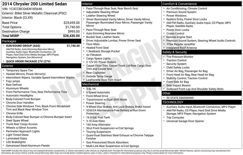 2014 Billet Silver Metallic Clearcoat Chrysler 200 Limited Black Leather, 1-Year SIRIUSXM Travel Link Service, 40GB Hard Drive w/28GB Available, 6.5 Touch Screen Display, Bluetooth® Streaming Audio, Garmin Navigation System, Hard Disc Drive, Power Express Open/Close Sunroof, Radio: Uconnect 430N CD/DVD/MP3/HDD/NAV, Rear-View Auto-Dimming Mirror w/Microphone, Remote USB Port, SiriusXM Travel Link, Sun/Sound Group, Touch Screen Display Monitor, Uconnect Voice Command w/Bluetooth.Odometer is 1415 miles below market average! 19/29 City/Highway MPGThis vehicle passed our Rigorous Safety inspection Performed by a Certified Technician. Value Internet Pricing: ALL of our customers receive REAL-TIME market value pricing. Our internet team spend countless hours ensuring we have the best price, based on equipment, mileage and condition. For your peace of mind, all of our vehicles include over 50 photos for you to judge the condition yourself. We provide a Carfax/ VIN history report and service records for every vehicle. As you do your comparison shopping, youâll see Ganley Chevy of Aurora offers the best values in the market. Weâre also prepared to offer the very best financing and warranty options. Nobody beats our interest rates! Have a car youâd like to sell? Weâll pay top dollar for it. For the most up-to-date pricing, photos, and inventory please visit www.GanleyGM.com. Call or stop by Chevy of Aurora today. 310 W. Garfield Rd. Aurora, Ohio 44202. 330-562-8585. Out of town buyers: free airport pick-up. We can help arrange delivery right to your front door too!At Ken Ganley Chevrolet Aurora, we are proud to be a trusted Chevrolet dealership serving Aurora, Ohio, and the surrounding communities including Cleveland, Akron, Solon, Twinsburg, Hudson, and Streetsboro. As part of the Ken Ganley Automotive Group, our mission is to deliver an exceptional automotive experience built on integrity, transparency, and outstanding customer service. We offer a wide selection of new Chevrolet vehicles, from dependable sedans to powerful trucks and family-friendly SUVs, along with a carefully inspected inventory of pre-owned and certified pre-owned vehicles. Whether youâre searching for a new Chevy Silverado, Equinox, Traverse, or a quality used car, our knowledgeable sales team is here to help you find the perfect fit for your lifestyle and budget. Beyond sales, our commitment continues with a state-of-the-art service and parts department staffed by factory-trained technicians. From routine maintenance to major repairs, we use genuine Chevrolet parts to keep your vehicle running at its best for years to come. At Ken Ganley Chevrolet Aurora, we value long-term relationships and strive to be the dealership you can rely on for all your automotive needs. We look forward to welcoming drivers from Aurora and nearby cities and helping you experience the difference of shopping with a dealership that truly puts customers first.