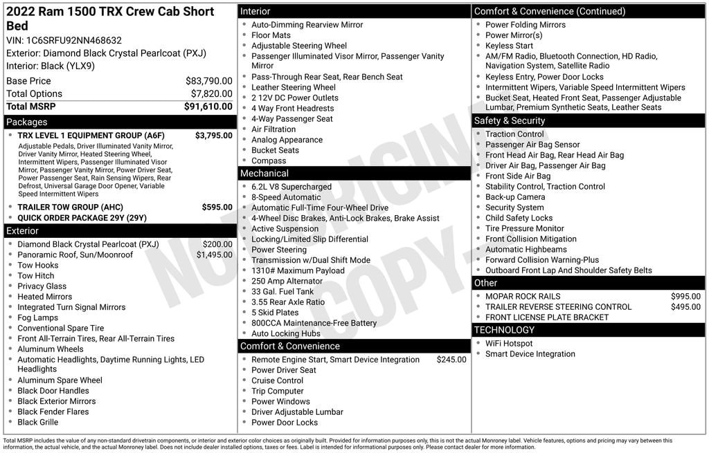 2022 Diamond Black Crystal Pearlcoat Ram 1500 TRX 1500 TRX, 4D Crew Cab, 6.2L Supercharged HEMI V8 SRT, 8-Speed Automatic, 4WD, Diamond Black Crystal Pearlcoat, Black Leather, #2 Seat Foam Cushion, 4 Way Front Headrests, Android Auto, Apple CarPlay, Backup Camera, Bluetooth Hands-Free, Body Color Door Handles, Bucket Seats, Center Console Parts Module, Dome Dual LED Reading Lamp, Driver/Passenger Wrapped Assist Handles, Dual-Pane Panoramic Sunroof, Front Door Accent Lighting, Front Seat Back Map Pockets, Full Length Premium Upgraded Floor Console, Heated Front Seats, Heated Steering Wheel, IP LED Ambient Light Pipe, Leather Trimmed Bucket Seats, Luxury Front Door Trim Panel, MOPAR Bright Pedal Kit, Pick-Up Box Lighting, Power 4-Way Driver Lumbar Adjust, Power 4-Way Passenger Lumbar Adjust, Power 8-Way Driver & Passenger Seats, Power Adjustable Pedals, Premium Wrapped IP Bezel, Quick Order Package 29Y, Rain Sensitive Windshield Wipers, Rear 60/40 Folding Seat, Rear Door Accent Lighting, Rear Underseat Compartment Storage, Rear Window Defroster, Remote Start, Sun Visors w/Illuminated Vanity Mirrors, Trailer Brake Control, Trailer Light Check, Trailer Tire Pressure Monitoring System, Trailer Tow Group, TRX Level 1 Equipment Group, Universal Garage Door Opener.